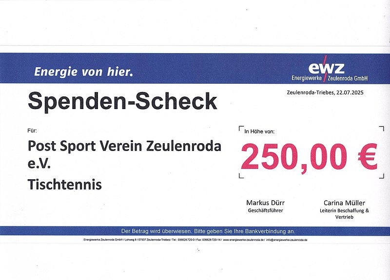 Beim Besuch des Trainingslagers zur Saisonvorbereitung in der Rötleinturnhalle übergab Carina Müller von den Energiewerken Zeulenroda GmbH dem Post SV Zeulenroda einen Spendenscheck.
