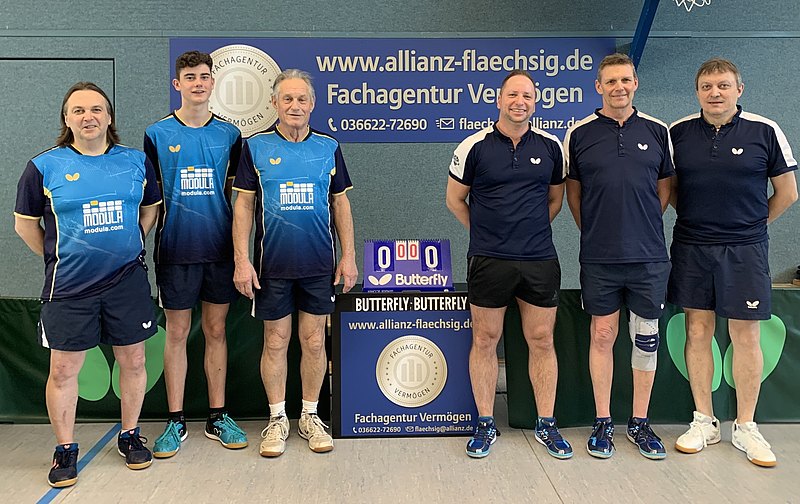 Vor Turnierbeginn versammelten sich beide Teams für ein gemeinsames Foto vor der neuen Sponsorentafel der Allianz Generalvertretung Thomas Flächsig, die den Verein mit ihrem Engagement unterstützt.