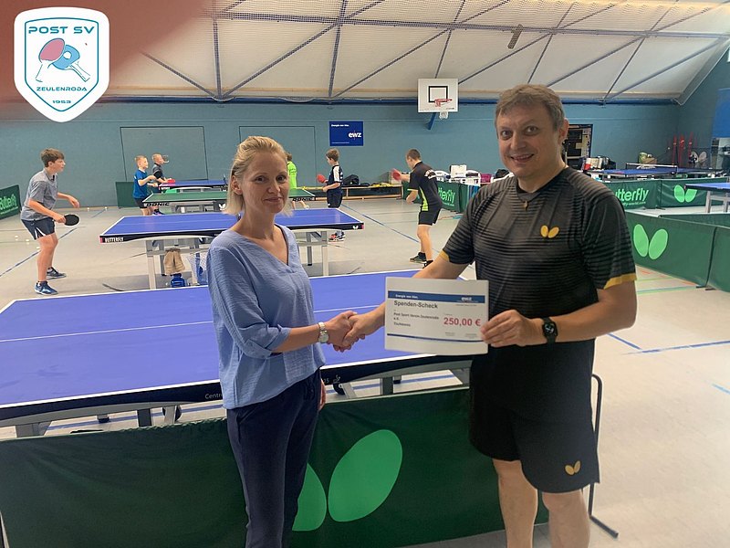 Beim Besuch des Trainingslagers zur Saisonvorbereitung in der Rötleinturnhalle übergab Carina Müller von den Energiewerken Zeulenroda GmbH dem Post SV Zeulenroda einen Spendenscheck.
